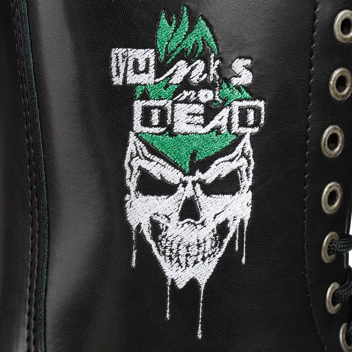 Ozdobione haftem skull PunksNotDead po zewnętrznej stronie butów.