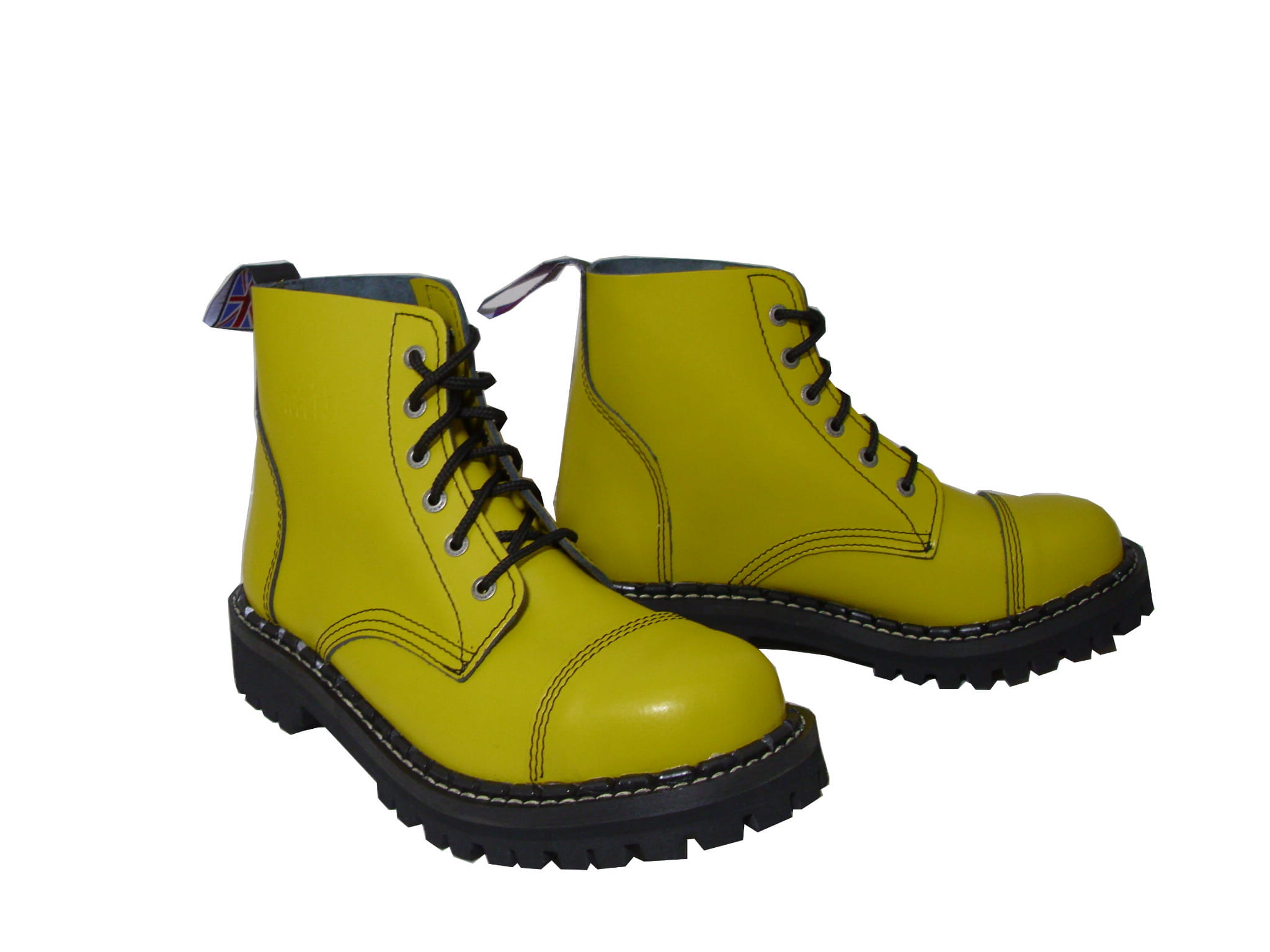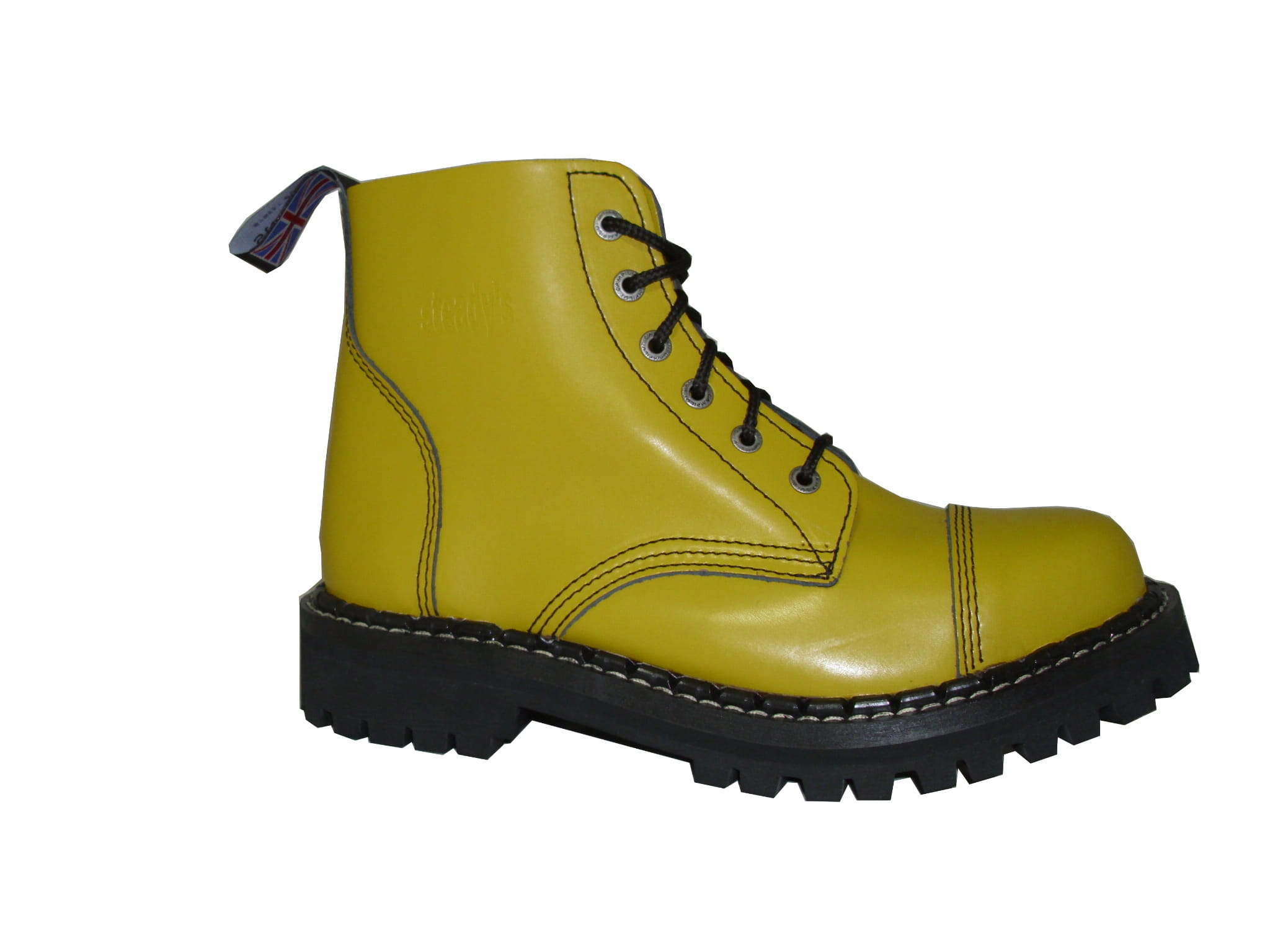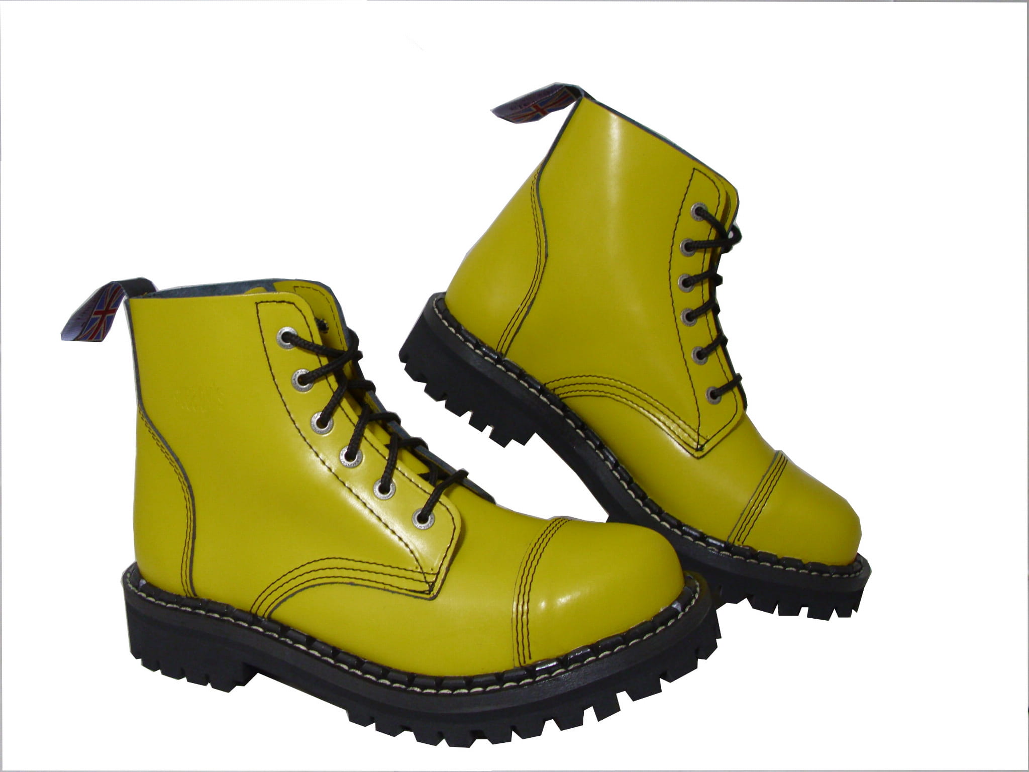 Rockowe Glany sześcio-oczkowe w super kolorze żółtym. Glany te idealnie nadają się na koncerty rockowe i nie tylko. Są tradycyjnie wzmacniane blachą w palcach.